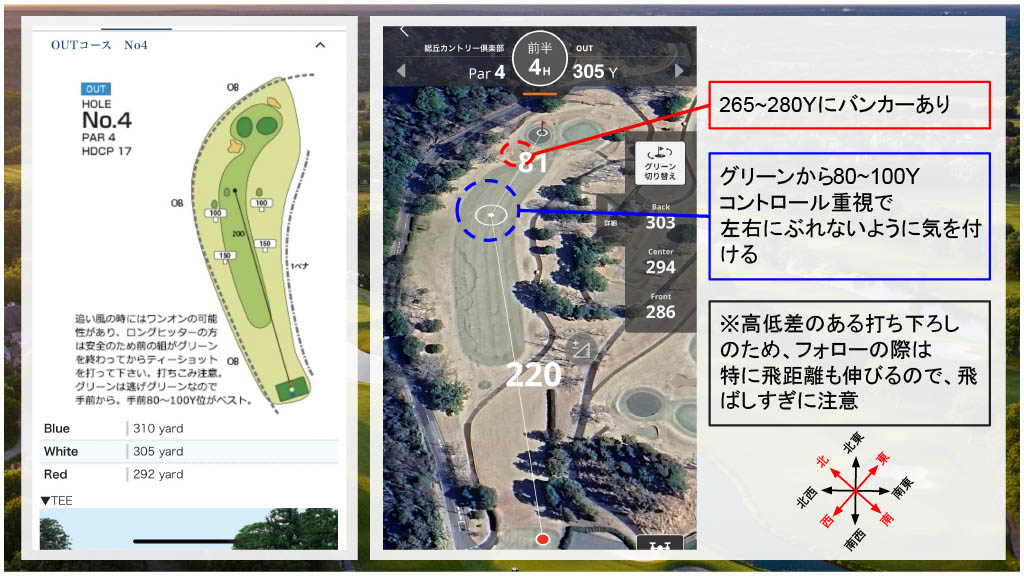 - OB/ペナ:左150Y地点から先OB / 右1ペナ+グリーン手前50Y付近からOBに切り替わる