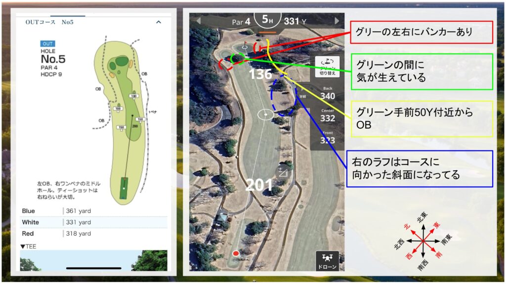 - OB/ペナ:160Y地点まで左右OB。以降右側は1ペナに。