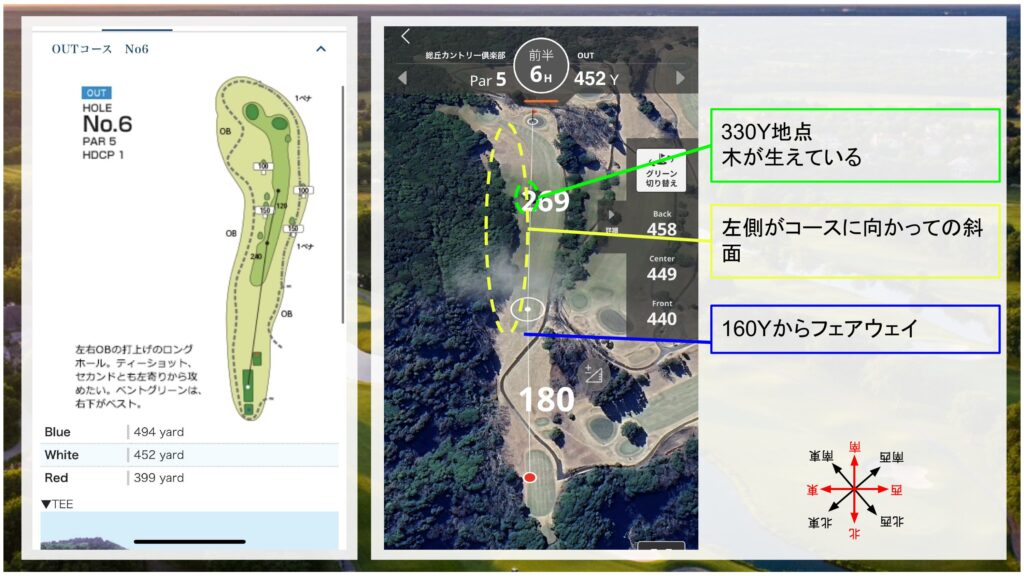 - その他:左ドックレックで、グリーンとグリーンの間に木が生えている。