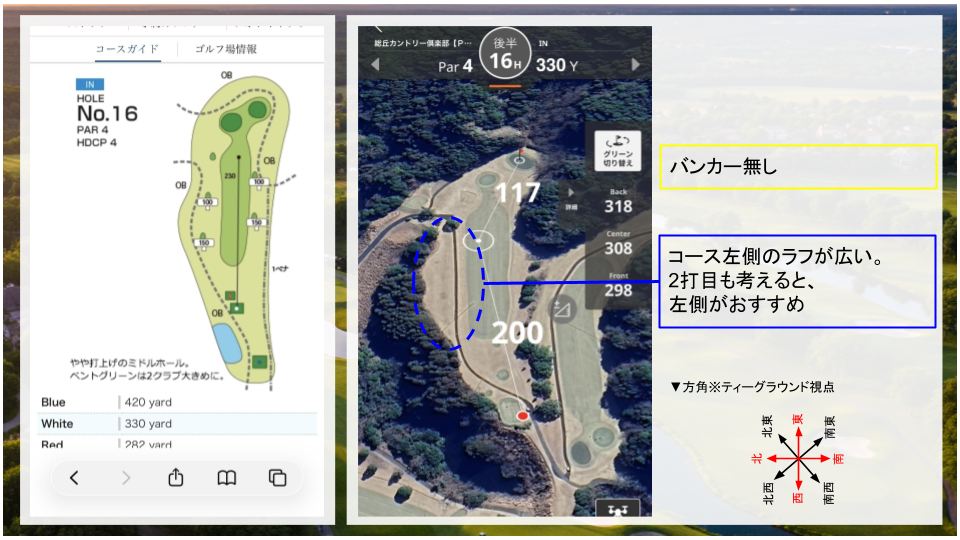 • その他:短めのパー4。ティーショットは方向性を重視して打ちたい。
