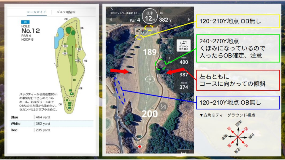 • 距離(White):左グリーン:382Y(ベント) / 右グリーン:382Y(高麗)