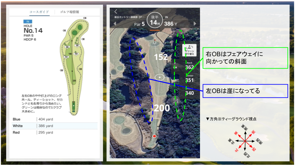 ただコース左の方がOBまで遠くプレッシャーも少ないので、左狙いもOK。