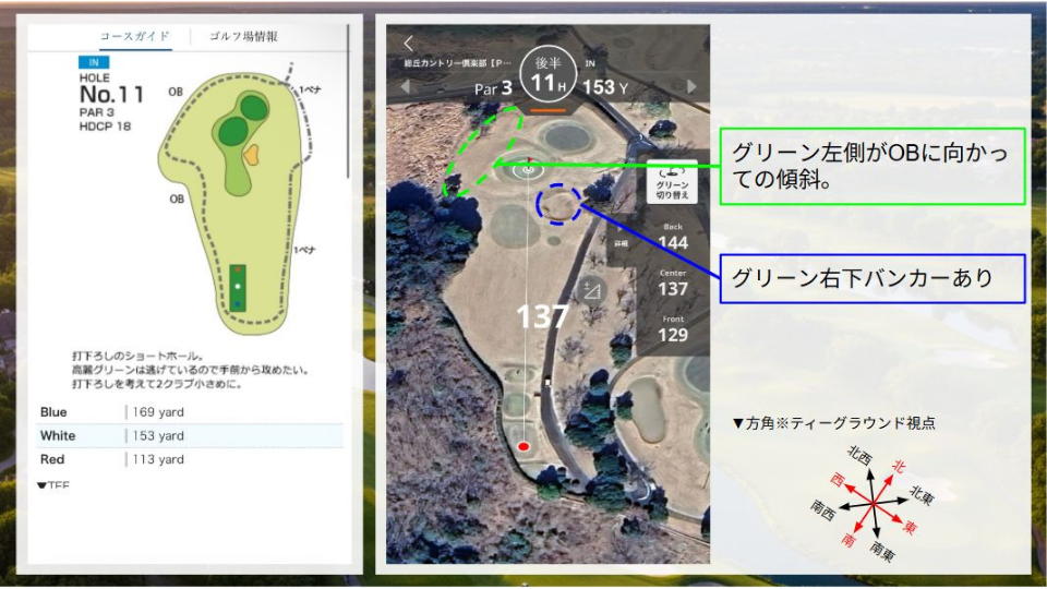 • 距離(White):左グリーン:137Y(ベント) / 右グリーン:156Y(高麗)