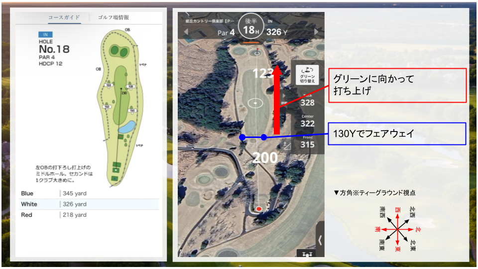 右に曲がってから打ち上げになるので、3打目は番手を上げる必要あり。