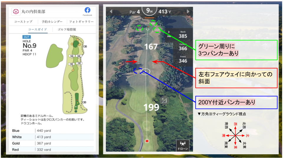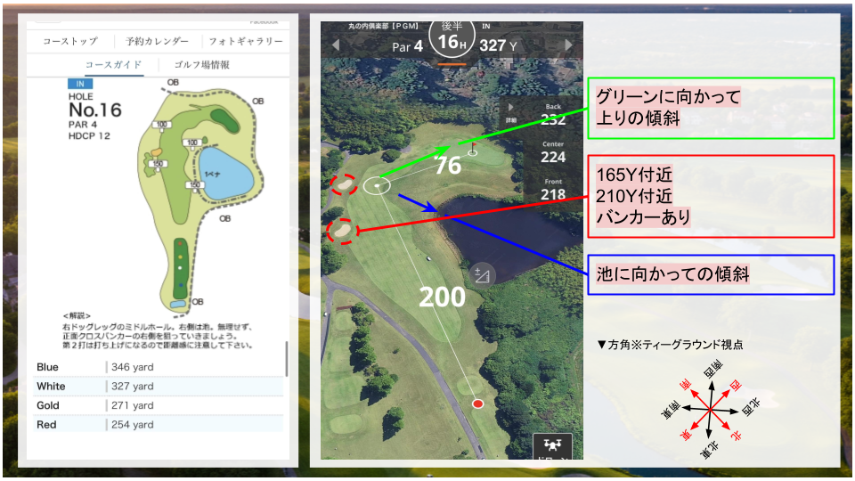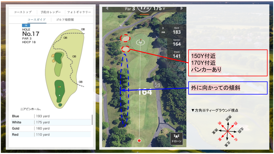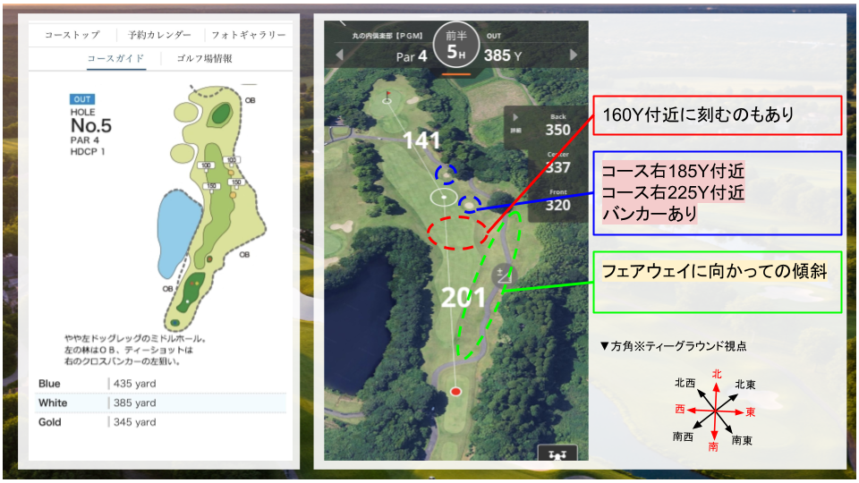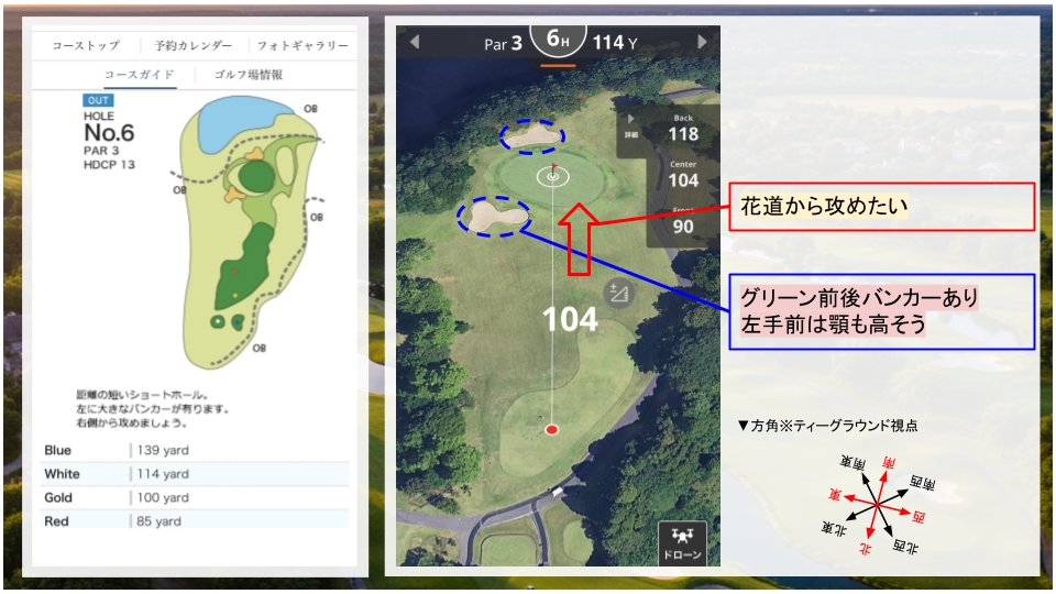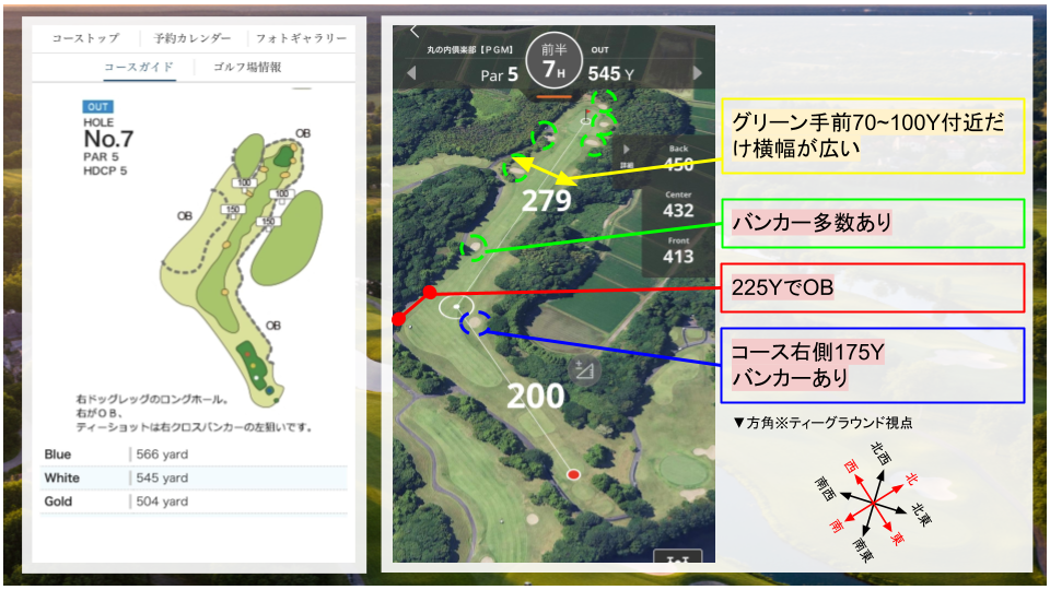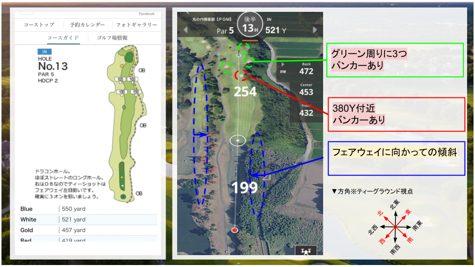 • その他:右ドッグレッグのコース。二打目は打ち上げになるので、距離感に注意。