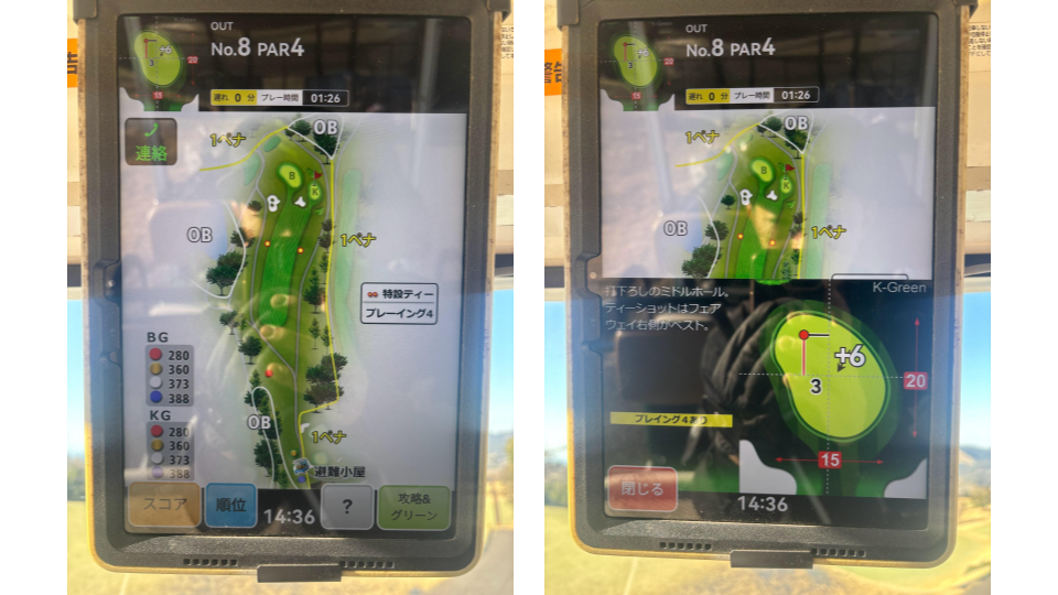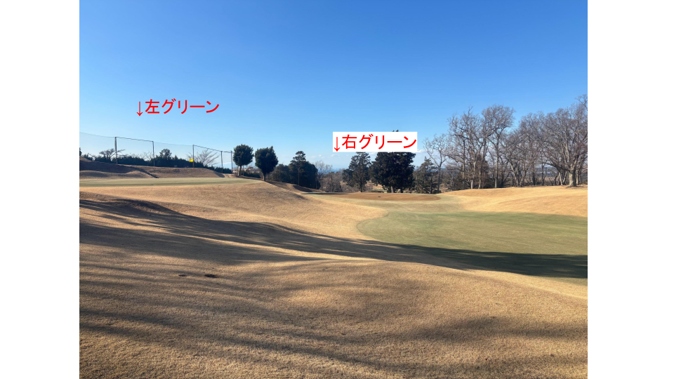 奥は1ペナ、バンカーがあるので、手前から攻めたい。