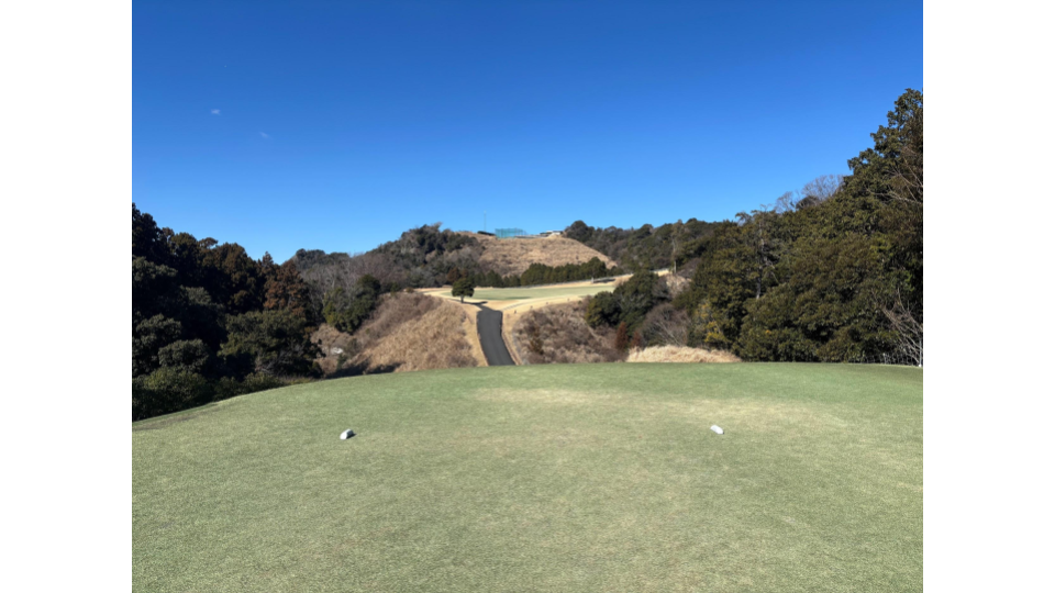 打ち下ろしのティーショット。ブルーティはめちゃくちゃ高い所だったが、白ティはかなり下るので、そこそこの打ち下ろし。