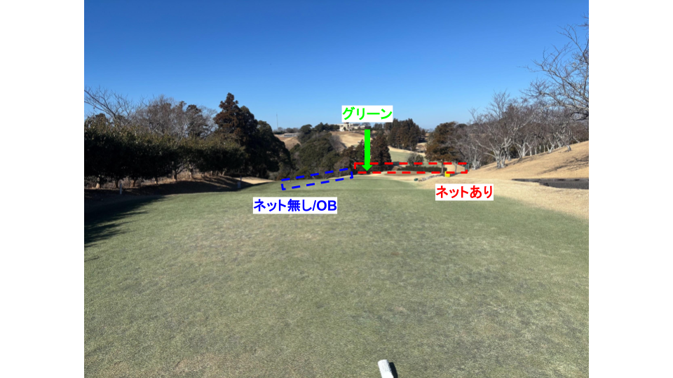グリーン奥側にはネットが引かれているが、左側にはネットは無くOBになる。